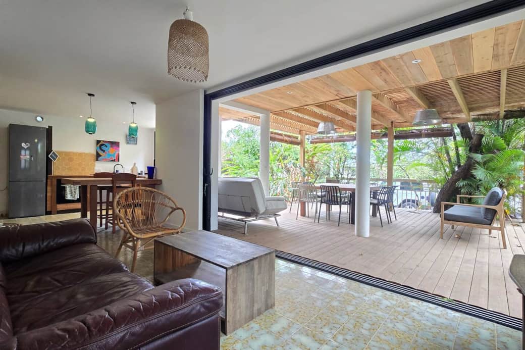 La propriété dispose de 3 salles d'eau avec douche, dont deux se trouvent au rez-de-chaussée (une à l'intérieur et une à l'extérieur), ainsi que de 3 toilettes, deux intégrées aux salles d'eau et une séparée. Le séjour, baigné de lumière, est aménagé avec un canapé et une alcôve de repos, et s'ouvre sur une cuisine américaine entièrement équipée, idéale pour préparer et partager des repas.